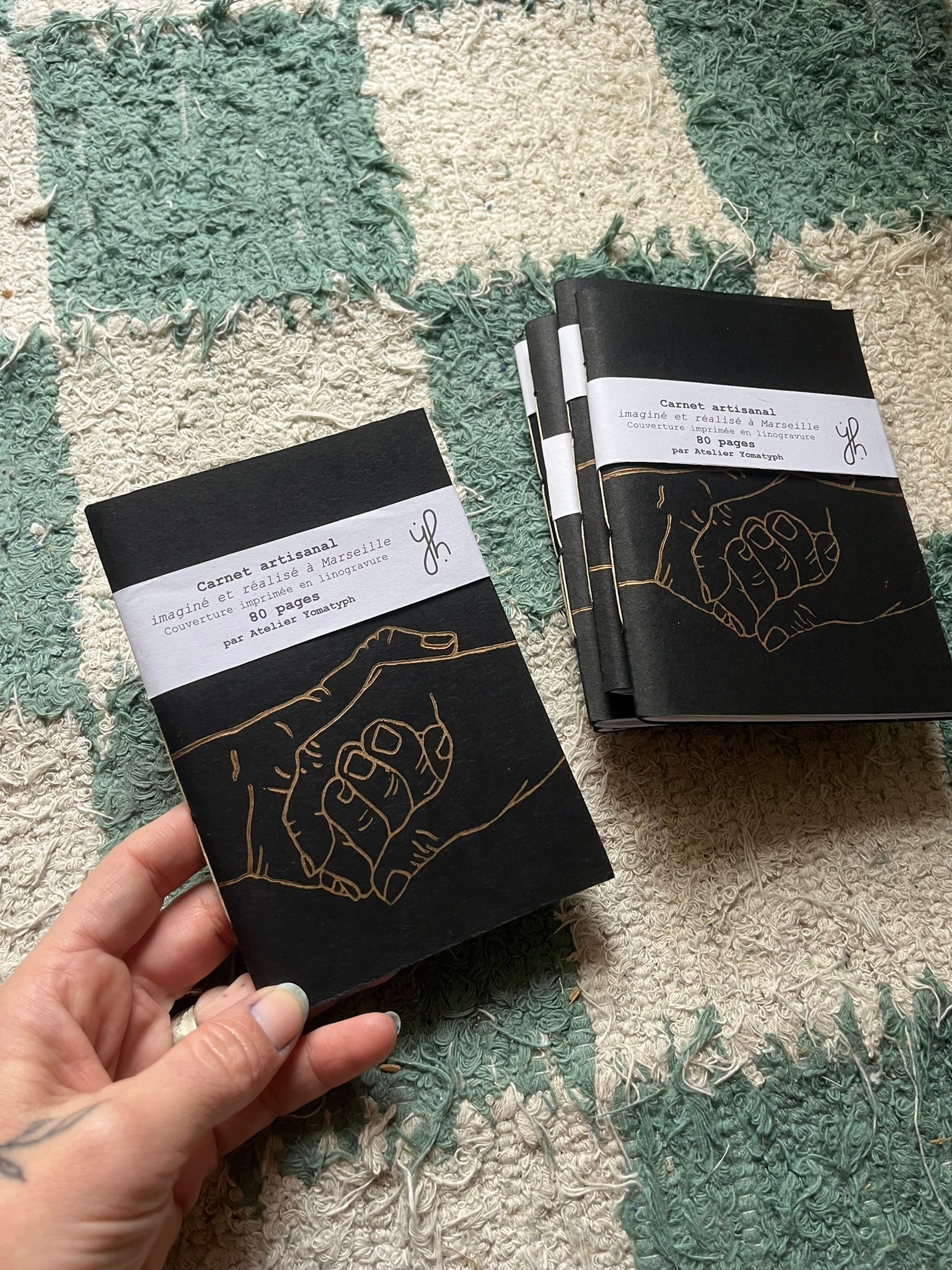 Carnet A6 mains or sur fond noir